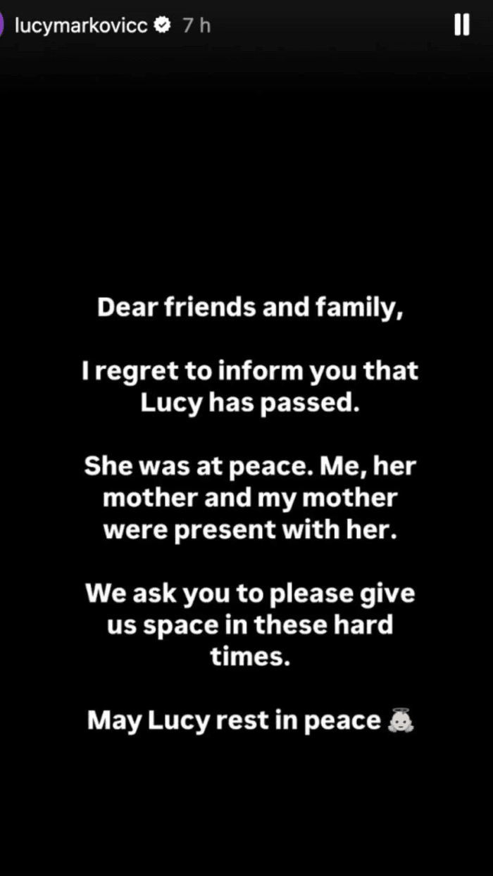 Theo chia sẻ từ người thân, Lucy Markovic đã trút hơi thở cuối cùng trong sự bình yên, được gia đình và bạn trai bên cạnh. Trước đó, cô đã trải qua ca phẫu thuật khẩn cấp và rơi vào hôn mê, khiến nhiều người không khỏi xót xa.