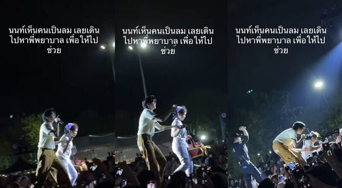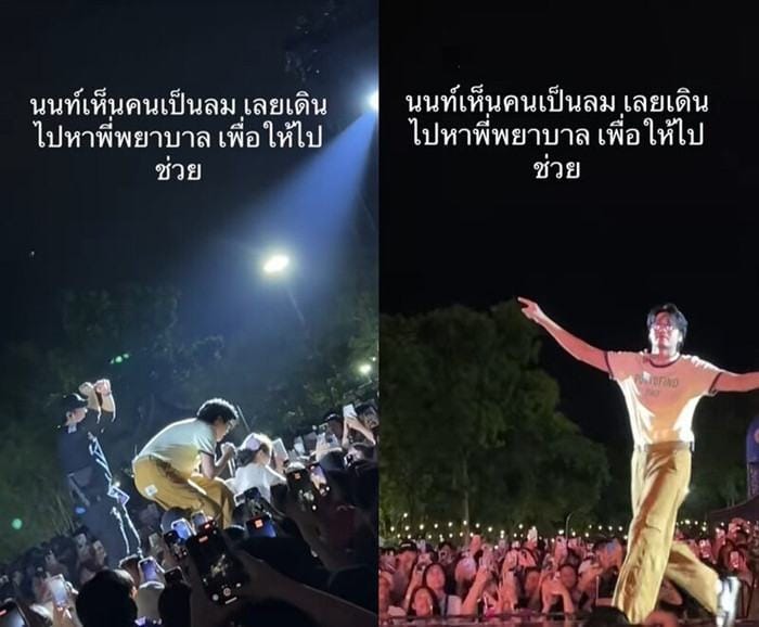 Trong khi tiếng hát “Are you okay?” vang lên, Non Thanon đã biến câu hỏi ấy thành hành động cụ thể. Anh nhanh chóng tìm y tá và đích thân dẫn họ đến chỗ khán giả gặp nạn, tất cả diễn ra trong sự chuyên nghiệp và tình người. Điều đáng nói là anh vẫn tiếp tục hát, như một cách để an ủi và giữ vững không khí đêm nhạc.
