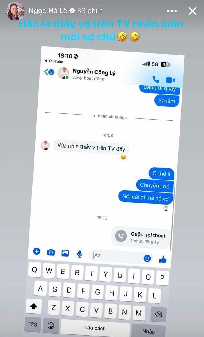 Mới đây, Ngọc Hà đã chia sẻ đoạn tin nhắn ngọt ngào giữa hai vợ chồng khi cô đang công tác tại Hàn Quốc. NSND Công Lý hào hứng nhắn: “Vừa nhìn thấy vợ trên TV đấy”, khiến Ngọc Hà không khỏi bật cười. Câu chuyện nhỏ nhưng đủ để thấy sự quan tâm và tình cảm chân thành của nam nghệ sĩ dành cho vợ.