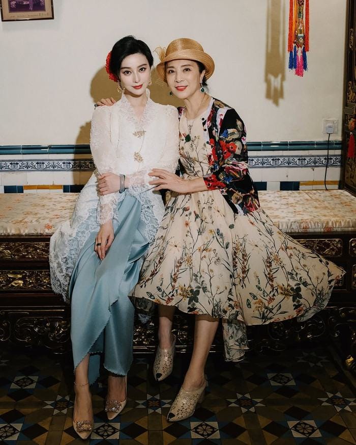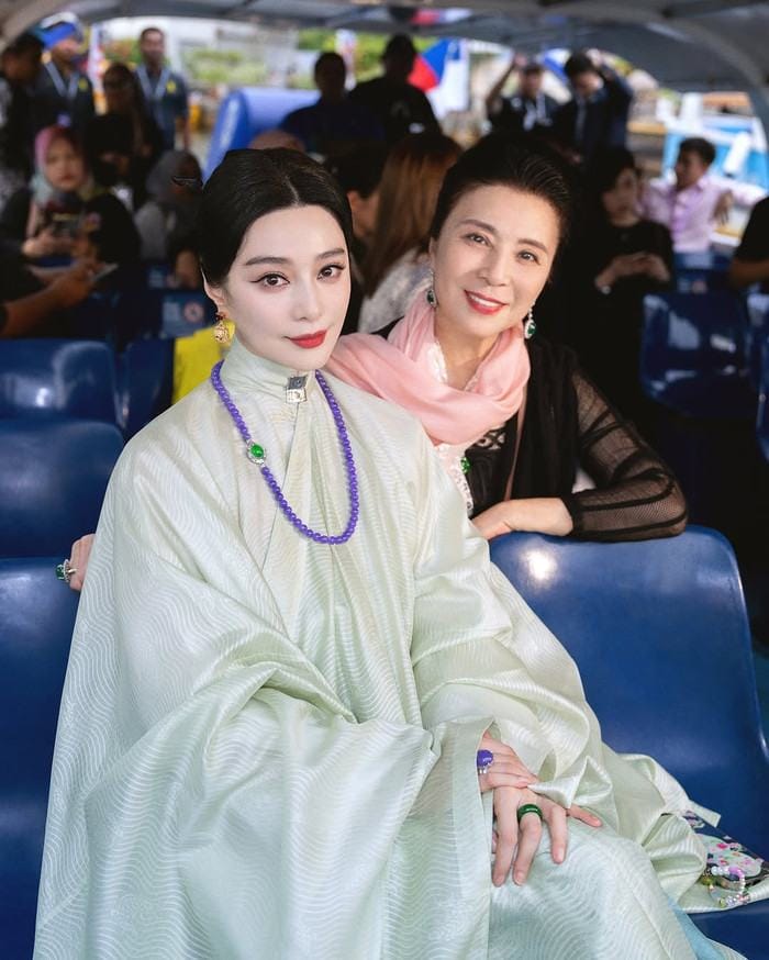 Phạm Băng Băng xuất hiện trong chiếc váy xanh nhạt, toát lên vẻ đẹp cổ điển như một mỹ nhân thời xưa. Trong khi đó, mẹ cô – bà Trương Chúc Linh – gây ấn tượng với phong cách thời trang tinh tế: áo dài tay đen xuyên thấu phối cùng khăn lụa hồng, tạo nên hình ảnh dịu dàng và đầy khí chất.