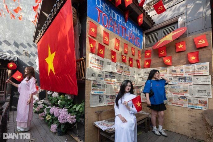 Nằm tại quận Nam Từ Liêm (Hà Nội), quán cà phê 2 tầng mang đậm phong cách cổ xưa đang trở thành điểm đến thu hút giới trẻ trong tháng 4. Hưởng ứng kỷ niệm 50 năm Ngày Giải phóng miền Nam, chủ quán đã biến không gian thành một biển cờ đỏ sao vàng, cờ Đảng và cờ Mặt trận Dân tộc Giải phóng miền Nam, tạo nên khung cảnh rực rỡ, đậm chất lịch sử.