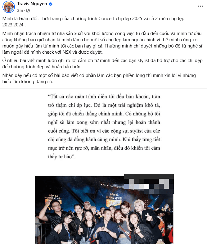 Travis Nguyễn nhanh chóng lên tiếng phản hồi, khẳng định chưa từng “nhận vơ” công sức của người khác. Anh giải thích rằng với những nghệ sĩ có ekip riêng, trách nhiệm của giám đốc thời trang là kiểm tra và phối hợp với nhà sản xuất. Travis cũng gửi lời xin lỗi nếu có bài báo gây hiểu lầm.