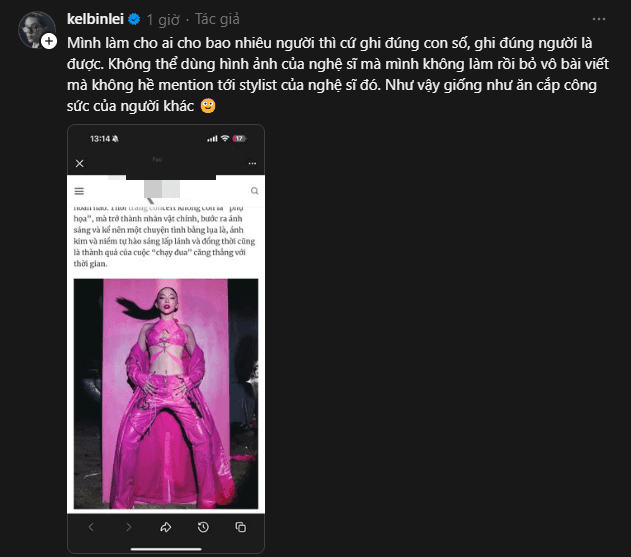 Kelbin Lei nhấn mạnh: “Tôn trọng đồng nghiệp không chỉ nằm ở cách cư xử, mà còn thể hiện rõ nhất ở việc bạn có đủ tử tế để không nhận vơ công sức người khác.”
