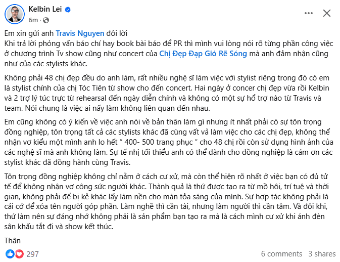 Không dừng lại ở đó, Kelbin Lei còn đăng tải một bài viết dài trên fanpage cá nhân, gọi tên Travis Nguyễn và nêu rõ những bức xúc. Anh cho rằng những hiểu lầm xuất phát từ việc Travis trả lời phỏng vấn thiếu minh bạch, dẫn đến truyền thông đưa tin sai lệch.