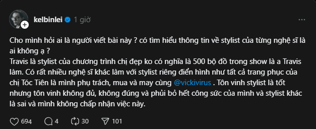 “Travis là stylist của chương trình Chị Đẹp không có nghĩa là 500 bộ đồ trong show là anh Travis làm. Có rất nhiều nghệ sĩ khác làm việc với stylist riêng, điển hình như tất cả trang phục của chị Tóc Tiên là mình phụ trách…” – Kelbin Lei thẳng thắn chia sẻ, cảm thấy công sức của mình và đồng đội bị phủ nhận.