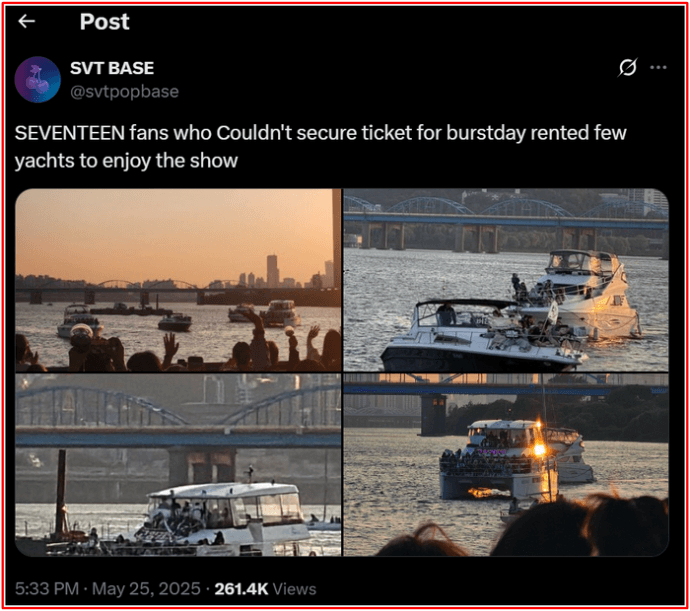 Vì lượng vé có hạn, nhiều CARAT đã sáng tạo thuê du thuyền để ngắm concert từ xa, biến sông Hàn thành khán đài độc đáo. Không dừng lại ở đó, họ còn khiến cộng đồng mạng xúc động khi tự nguyện xếp ghế, mở lối đi giúp mọi người ra về dễ dàng sau show diễn.