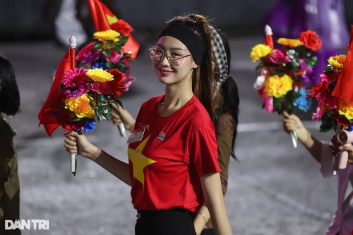 Hoa hậu H’Hen Niê xuất hiện với cờ và hoa trong tay, liên tục vẫy chào khán giả với nụ cười rạng rỡ. Cô chia sẻ: “Được tham gia sự kiện này là niềm vinh dự lớn lao, tôi cảm thấy tự hào khi đóng góp một phần nhỏ vào ngày trọng đại của đất nước”.