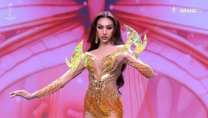 Một thí sinh Thái Lan đã chọn bộ váy dạ hội có thiết kế tương tự chiếc đầm lấy cảm hứng từ cung Bò Cạp của Kỳ Duyên. Với tông vàng gold lấp lánh, tua rua cánh tay và cầu vai 3D mô phỏng càng Bọ Cạp, chiếc váy này gần như là bản sao của thiết kế từng giúp Kỳ Duyên tỏa sáng tại Miss Universe 2024.