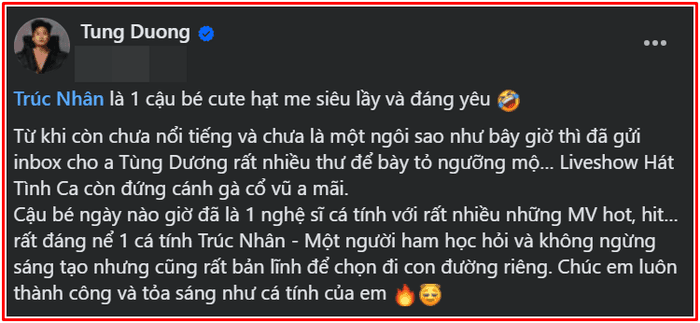 Không chỉ dừng lại ở đó, Tùng Dương còn dành những lời khen ngợi chân thành cho Trúc Nhân: “Cậu bé ngày nào giờ đã là 1 nghệ sĩ cá tính với rất nhiều những MV hot, hit… rất đáng nể”. Trúc Nhân cũng không quên “đáp trả” bằng một bình luận hóm hỉnh: “Em giấu gần chết, anh đi anh up lên Facebook”, khiến người hâm mộ càng thêm yêu mến cặp đôi này.