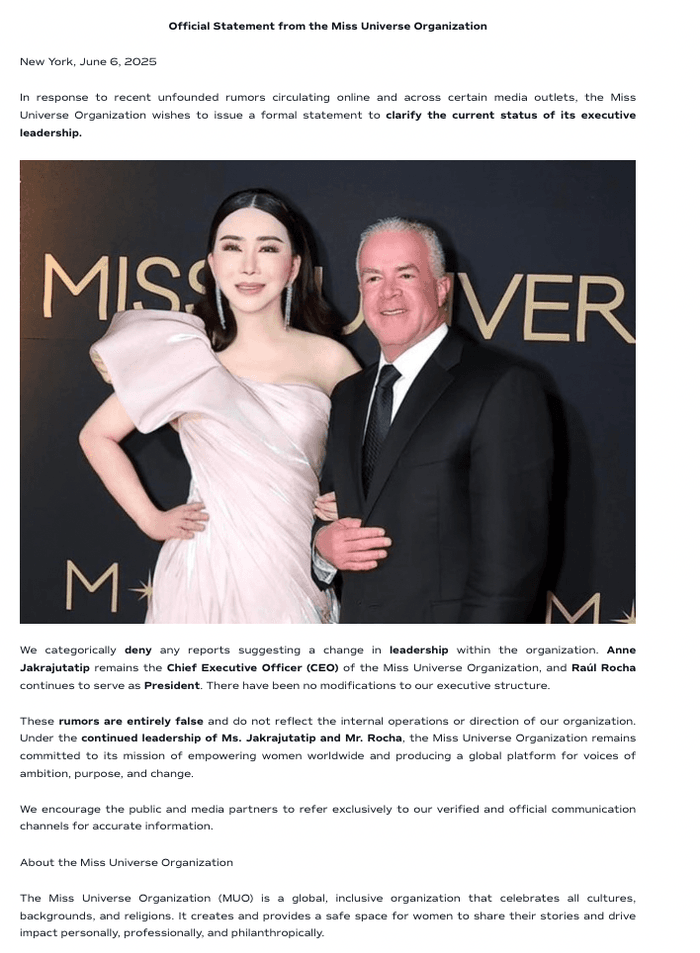 Ngày 7/6, Miss Universe chính thức lên tiếng bác bỏ mọi tin đồn về việc thay đổi nhân sự cấp cao. Tổ chức này khẳng định nữ tỷ phú chuyển giới người Thái Lan – Anne Jakrajutatip vẫn là CEO, đồng thời ông Raúl Rocha tiếp tục giữ chức Chủ tịch. Mọi thông tin về việc bà Anne rút lui đều là sai sự thật.