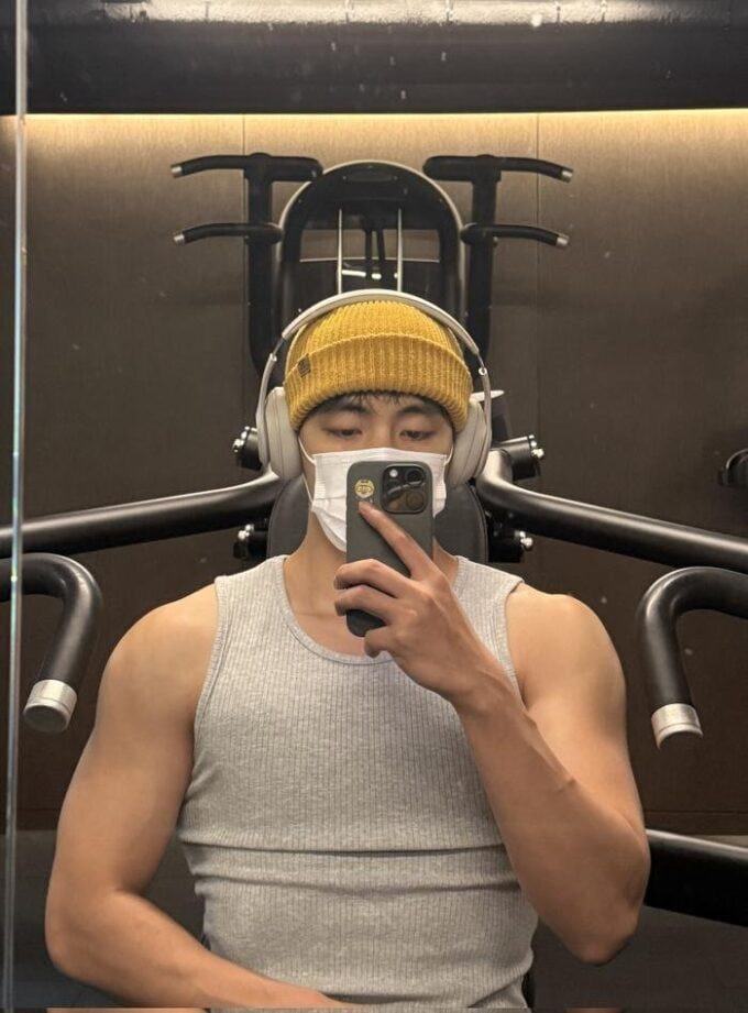 Trong ảnh, V xuất hiện với chiếc áo tank top xám, đeo khẩu trang và đội mũ lưỡi trai, nhưng vẫn toát lên vẻ mạnh mẽ. Một bức khác, anh cầm thanh tạ, khoe cơ bắp cuồn cuộn khiến fan không khỏi trầm trồ.