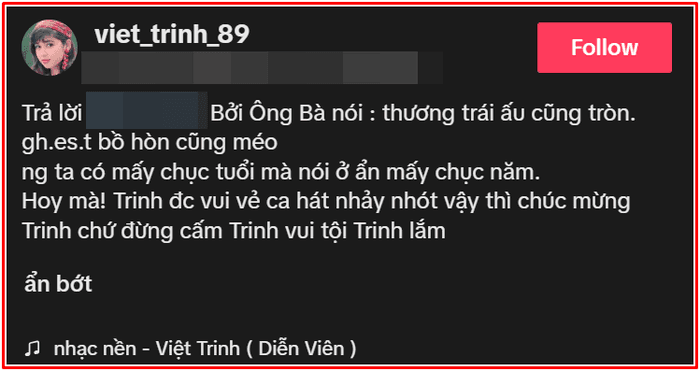 Một thời là biểu tượng nhan sắc của màn ảnh Việt, Việt Trinh giờ đây lại khiến cộng đồng mạng xôn xao với những clip nhảy múa, ca hát đầy năng lượng trên TikTok. Dù đã rời xa ánh đèn sân khấu, “Người đẹp Tây Đô” vẫn giữ được vẻ rạng rỡ, trẻ trung khiến nhiều người ngưỡng mộ. Tuy nhiên, không phải ai cũng ủng hộ phong cách “tự do” của cô.