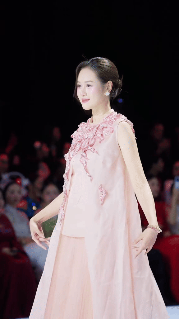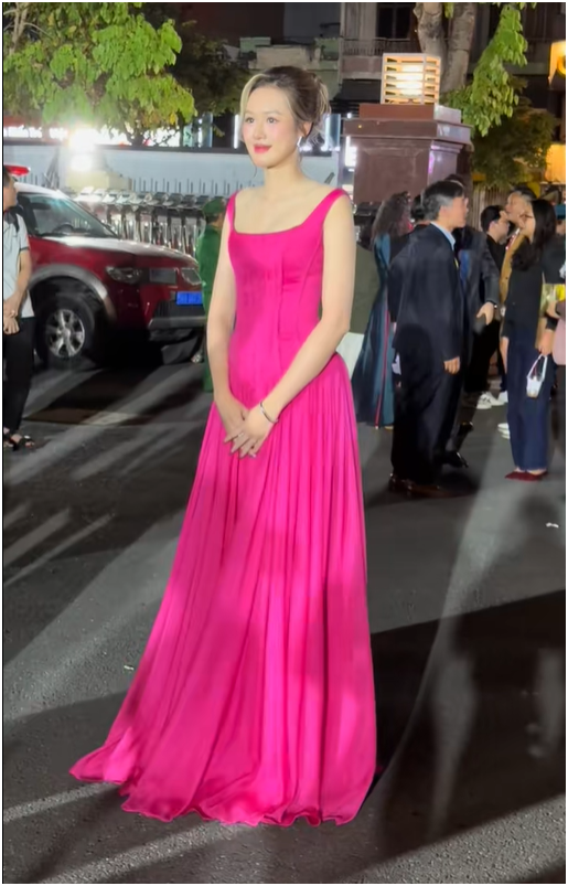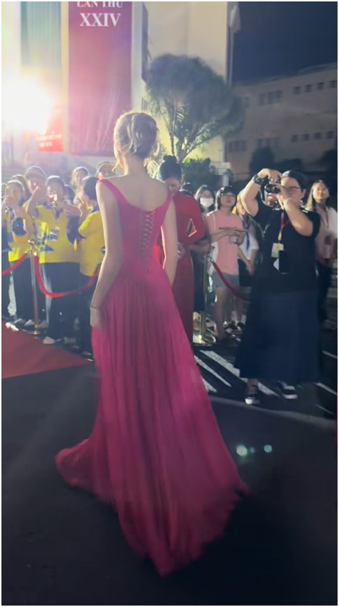 Chiếc đầm dài màu hồng cánh sen ôm sát cơ thể, kết hợp với mái tóc sáng màu phá cách – tất cả tạo nên một tổng thể hài hòa đến mức, như lời đồn đoán, “đến antifan lâu năm của màu hồng cánh sen cũng phải giật mình”. Vóc dáng thon thả cùng gương mặt sáng bừng của cô khiến nhiều người không khỏi thốt lên: “Nên đi thi hoa hậu đi chứ!”.