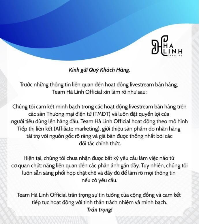 Trong thông báo, Hà Linh nhấn mạnh: “Chúng tôi cam kết minh bạch trong các hoạt động livestream bán hàng trên các sàn thương mại điện tử và luôn đặt quyền lợi của người tiêu dùng lên hàng đầu.” Cô cũng cho biết hiện chưa nhận được yêu cầu làm việc từ cơ quan chức năng nhưng sẵn sàng hợp tác nếu có.