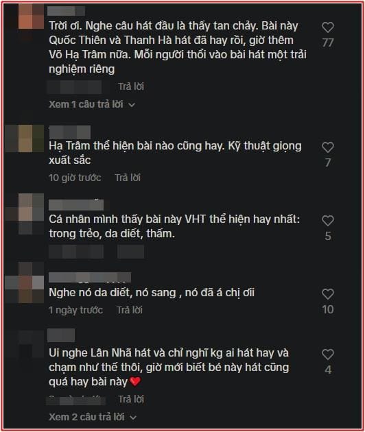 Ngay sau khi đoạn clip được đăng tải trên TikTok, hàng loạt lời khen ngợi đã đổ về phía nữ ca sĩ. Một khán giả chia sẻ: “Mỗi người mang đến một màu sắc riêng, và Võ Hạ Trâm đã thổi hồn vào bài hát bằng cảm xúc rất riêng.” Dù không gây bão như những phiên bản trước, nhưng cách thể hiện của cô lại tạo được dấu ấn sâu đậm.