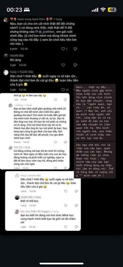 Bản thân Bích Hạnh cũng không ngại đáp trả cứng rắn: “Nào, bạn cứ cho xin cái nick thật để đối chứng nào… Chứ bố mẹ mình mà dùng tiktok mình cũng tag vào rồi đấy”. Cô tâm sự giữa đêm: “Ai làm gì sai thì sẽ bị nghiệp quật thôi… Các bạn chê bôi nên tìm hiểu lại và tôn trọng sự thật”.