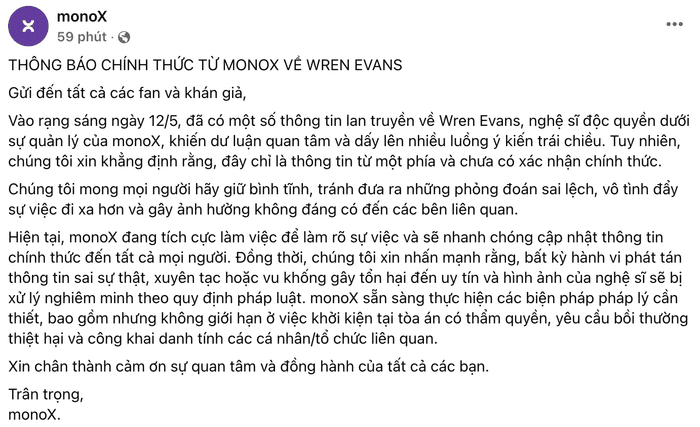Phía Wren Evans cũng khẳng định sẽ sớm cập nhật thông tin chính thức đến khán giả. Đặc biệt, họ cảnh báo sẽ xử lý nghiêm minh những hành vi phát tán thông tin sai sự thật, xuyên tạc hoặc vu khống nhằm bảo vệ uy tín của nghệ sĩ.