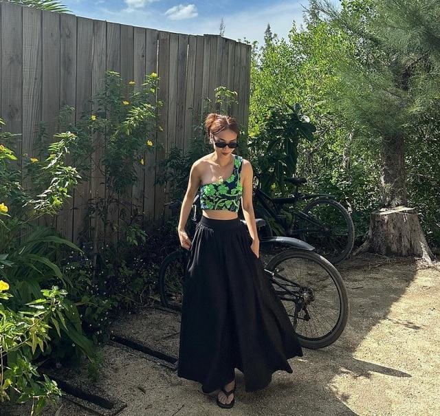Yến Trang còn gợi ý nhiều công thức thời trang khác như áo hai dây đan móc mix chân váy denim, hay áo crop top họa tiết kết hợp chân váy đen chữ A. Mỗi set đồ đều mang đậm dấu ấn cá nhân và phù hợp với phụ nữ tuổi 40.