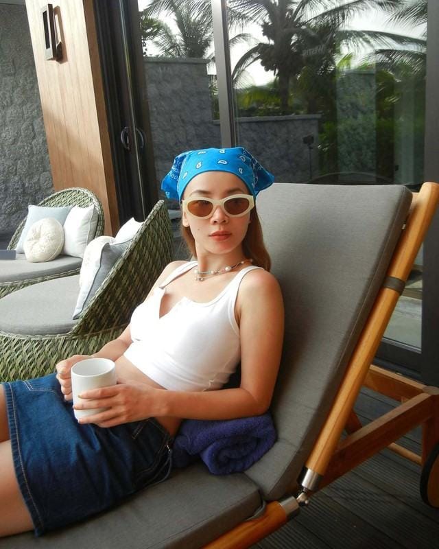 Set đồ crop top trắng và chân váy denim ngắn là minh chứng cho phong cách trẻ trung, năng động của Yến Trang. Những món phụ kiện như vòng cổ, khăn họa tiết trùm đầu càng làm nổi bật vẻ ngoài của cô.